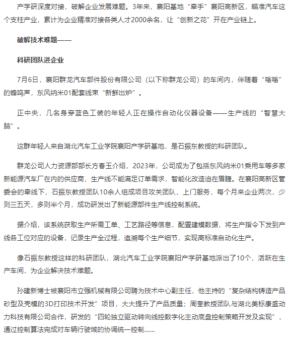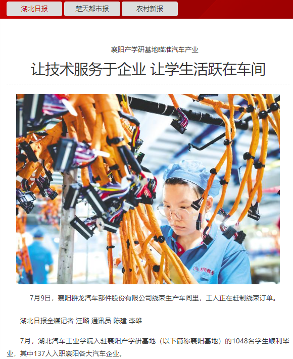 【湖北日报】襄阳产学研基地瞄准汽车产业 让技术服务于企业 让学生活跃在车间