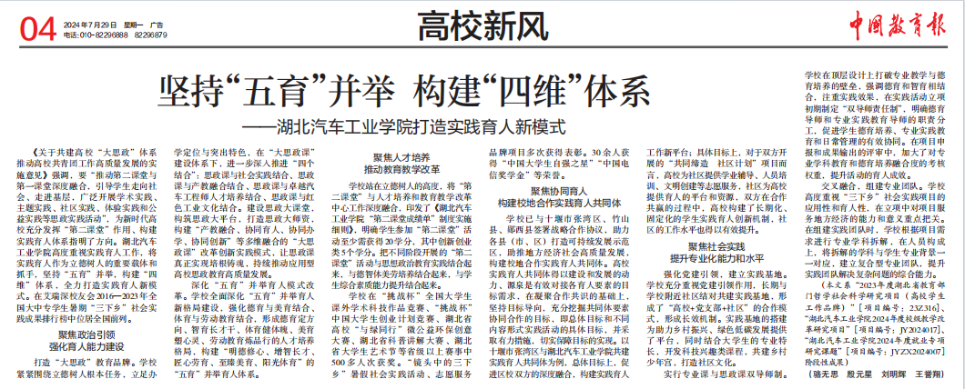 打造“大思政”教育品牌。学校紧紧围绕立德树人根本任务,立足办学定位与突出特色,在“大思政课”建设体系下,进一步深入推进“四个结合”:思政课与社会实践结合、思政课与产教融合结合、思政课与卓越汽车工程师人才培养结合、思政课与红色工业文化结合。建设思政大课堂,构筑思政大平台,打造思政大师资,构建“产教融合、协同育人、协同办学、协同创新”等多维融合的“大思政课”改革创新实践模式,让思政课真正实现培根铸魂,持续推动应用型高校思政教育高质量发展。