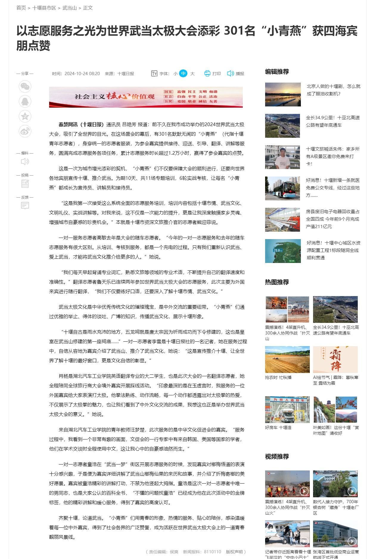 【十堰日报】以志愿服务之光为世界武当太极大会添彩301名“小青燕”获四海宾朋点赞