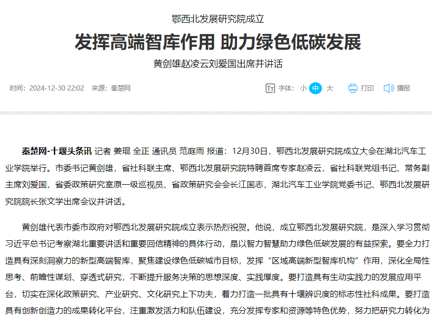 【秦楚网】鄂西北发展研究院成立:发挥高端智库作用 助力绿色低碳发展
