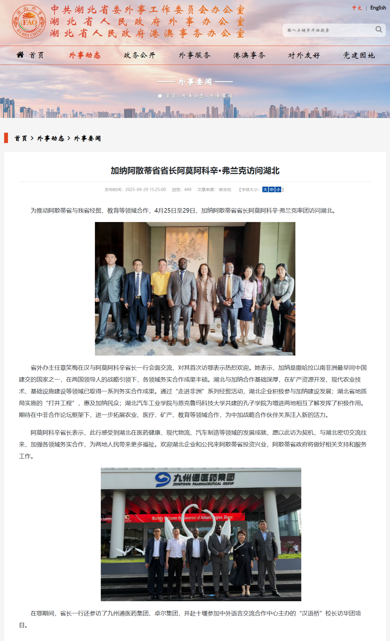 【湖北外事网】加纳阿散蒂省省长阿莫阿科辛·弗兰克访问湖北